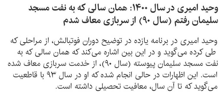 پس از مدتی مدعی شد که همان زمان که به نفت مسجد سلیمان رفته از سربازی هم معاف شده در حالی پیش از آن از معافیت تحصیلی تا سال 93 صحبت می کرد.