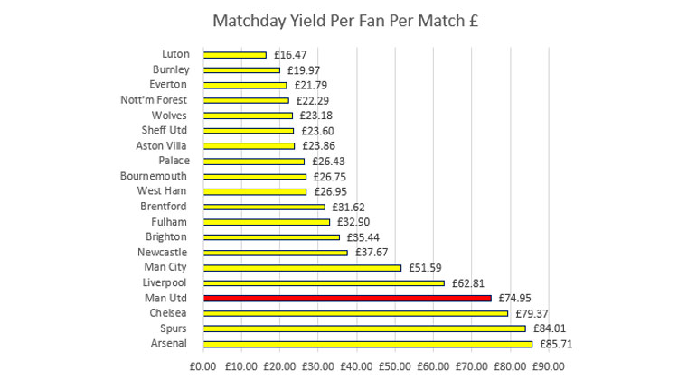 کیرن مگوایر، کارشناس مالی فوتبال، در حساب خود در پلتفرم X نوشت که درآمد منچستریونایتد از هر هوادار در فصل گذشته از ۹۷.۹۶ دلار به ۱۰۲.۲۸ دلار افزایش یافته است. هرچند این رقم هنوز پایینتر از باشگاههای بزرگ لندن است، اما از هر تیم دیگری در لیگ برتر بالاتر است و نشان میدهد که راهبرد پذیرایی ویژهٔ باشگاه، حتی در یک فصل ناامیدکننده، به افزایش درآمد از هواداران کمک کرده است.