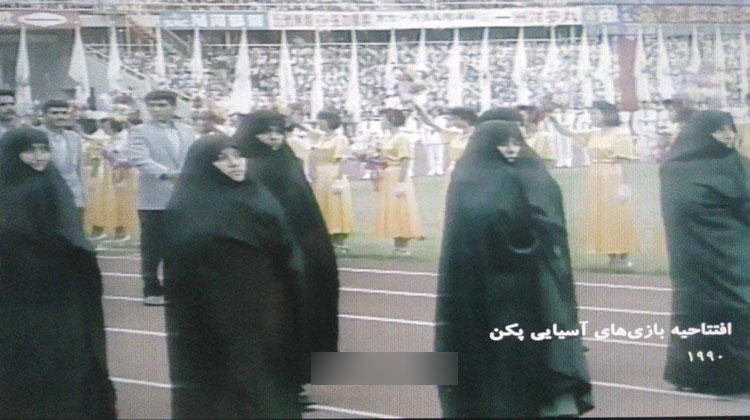 نخستین رویکرد برای حضور زنان در ورزش همزمان با بازی های آسیایی پکن 1990 و دوران پس از جنگ در سال 1369 بود زمانی که جریان نظامی مسلط شده به سازمان تربیت بدنی تصمیم گرفتند تعدادی از کارمندان حراست و اداری سازمان تربیت بدنی را در قالب ورزشکار در رژه بازی های آسیایی با چادر مشکی وارد کنند و در فینال بازی های فوتبال پس از قهرمانی تیم ملی ایران سربندهای مذهبی از دوران جنگ را به سر بازیکنان تیم ملی بستند!