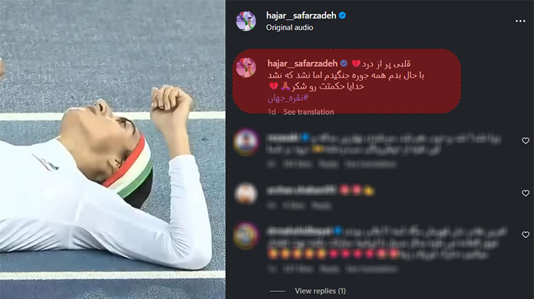 در تازه ترین دستاورد دستورهای نانوشته و فشارهای پنهانی به ورزشکاران زن، هاجر صفرزاده با وجود قوانین جهانی برای داشتن همراه دونده مرد، به دلیل استناد به مسایل مذهبی بی ربط به ورزش از داشتن همراه محروم بود و نتوانست از کمک او برای درک وضعیت رسیدن به خط پایان و رسیدن حریف انگلیسی با خبر شود و حالا با قلبی پر از درد فقط در اینستگرامش شکایت می کند.